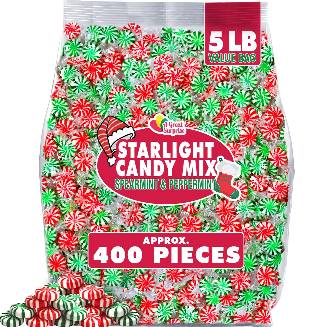 A Great Surprise Starlight Mints Bulk - 5 Pounds - Christmas Refreshing Candy Individually Wrapped - Spearmint and Peppermint Hard Candy - Office, Hospitality