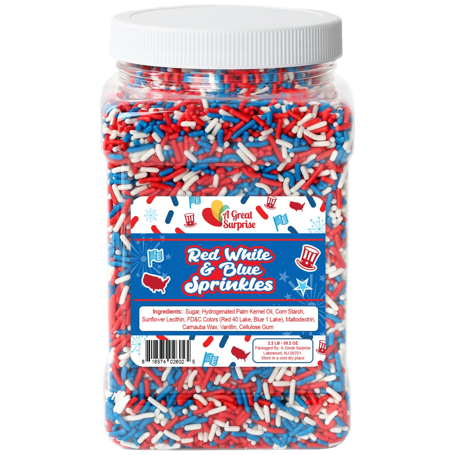 Red White and Blue Sprinkles - 2.2 Pounds - Patriotic Toppings - Bulk American Jimmies for Baking, Cupcakes