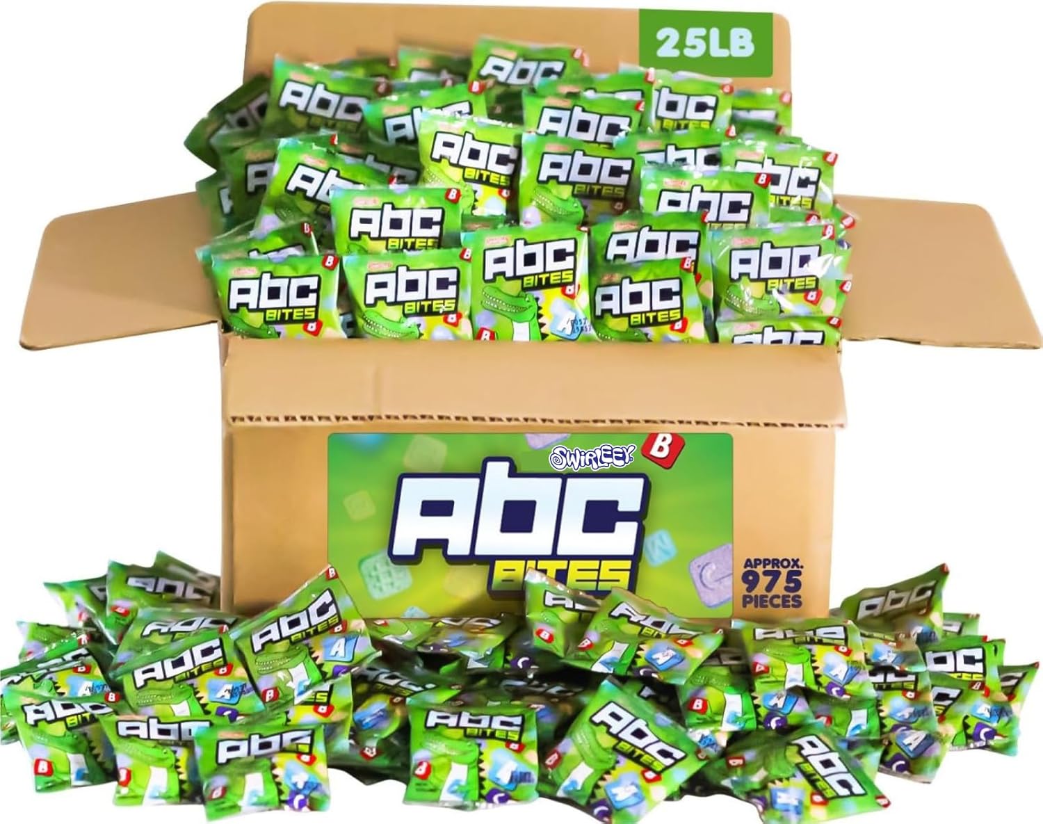 Bulk Swirleey ABC Bites Candies - Approx. 975 Fun Size Packs - 25 Pound Wholesale Box - Alphabet Candy - Candy Letters for Back to School, Preschools