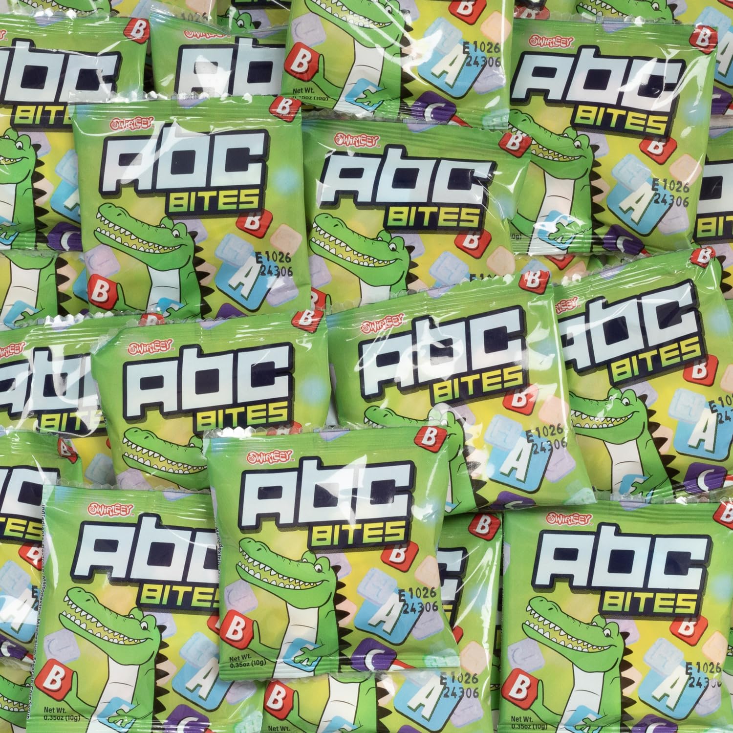 • Bulk 25-Pound Case of Swirleey ABC BITES – Enjoy a wholesale box filled with mini packs of ABC BITES, the classic hard candy squares, each stamped with fun letter printings. Perfect for any occasion!